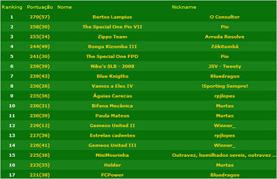 Pois é!! muito que eu me esforça não passo da liga dos últimos, depois de ter passado o "coração" voltei novamente para baixo, não passo de uma equipa banal ainda não é este ano que luto pelos 10 primeiros.
